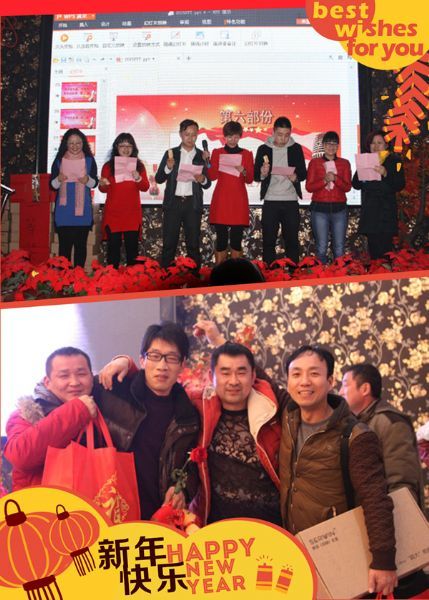 各部门的文艺表演、激动人心的抽奖活动和雷人的游戏穿插在丰盛的团年晚宴中,公司设置了各类丰富的奖品,大家一边吃着丰盛的晚宴,一边不时接受幸运的眷顾,层层的抽奖环节令人激动不已!大奖让中奖者欢呼连连,也让未能中奖者唏嘘不已。各部门自编自演的文艺演出和游戏精彩纷呈,搞笑的表演和雷人的游戏让大家捧腹不已;办公室和业务部联合表演的《快乐快板》拉开了晚会的序幕;女声独唱、男女声对唱,让现场气氛逐渐推至高点;生产部表演的双簧,幽默诙谐,赢得了台下阵阵掌声和欢呼声;方言串烧等创意节目为大家带来了一场视听的盛宴。